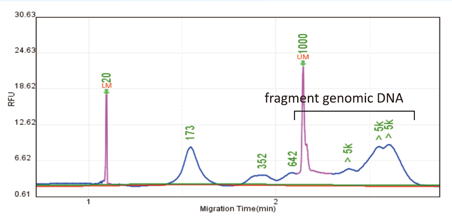 To analyze cfDNA, we provide a High Sensitivity Cartridge (N1, C105105) to detect samples down to picogram level since the concentration of cfDNA is low (1 to 100 ng per ml of plasma). With Qsep Series instruments, users can get reliable size and purity results of cfDNA in 2-3 minutes.