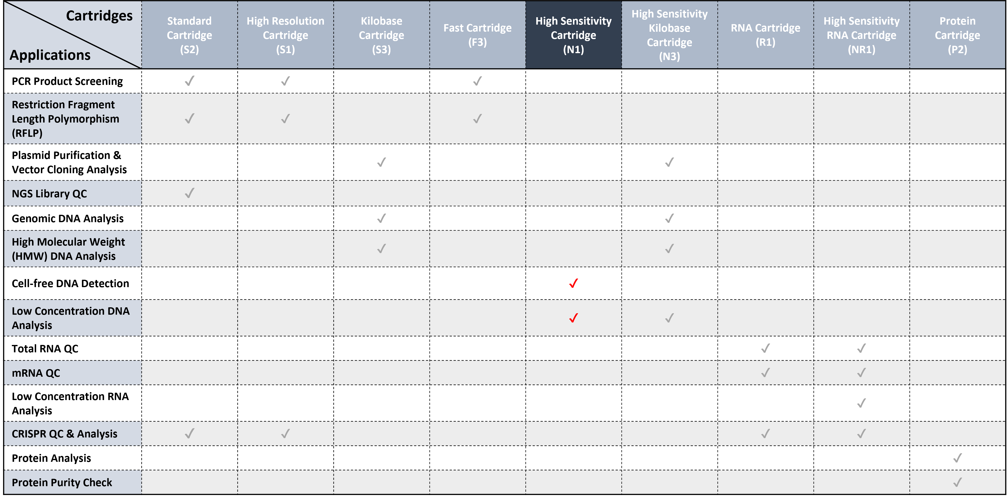 N1 High Sensitivity Cartridge is ideal for low concentration DNA analysis. It has a detection limit of 5 pg/μl or 1 pg/μl if sample is dissolved in ddH2O or in special condition. The analysis size range is up to 5,000bp for cell-free DNA and other low concentration fragments analyses. The whole process takes about 3 minutes to finish.