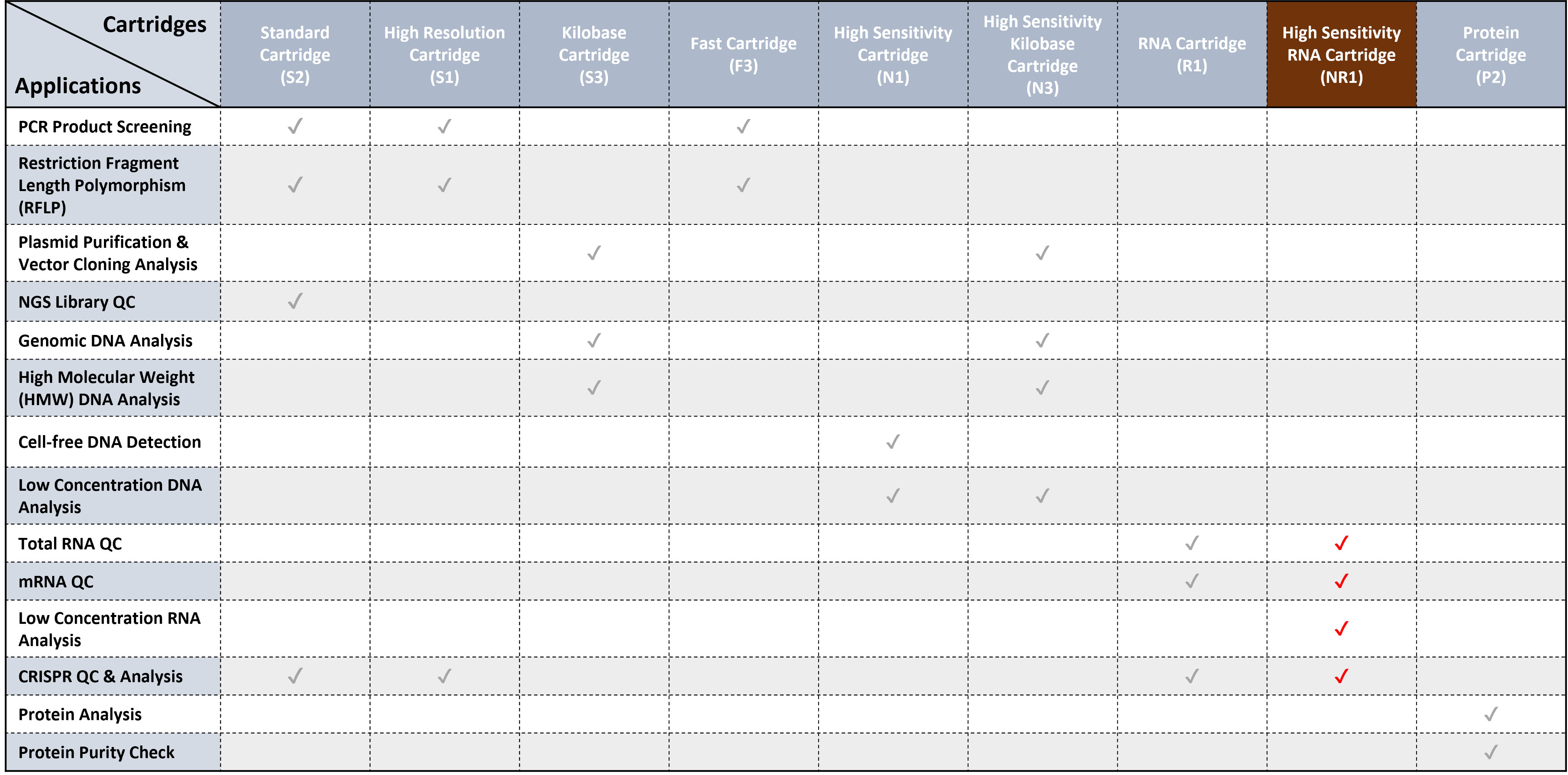 NR1 cartridge is High Sensitivity RNA Cartridge. It analyzes low-concentration RNA. Same as R1 cartridge, it can identify integrity and degradation degree of RNA. After the analysis, the system will provide reference value of RNA Quality Number (RQN) and image for user to further evaluate the possibility of conducting the following examinations.