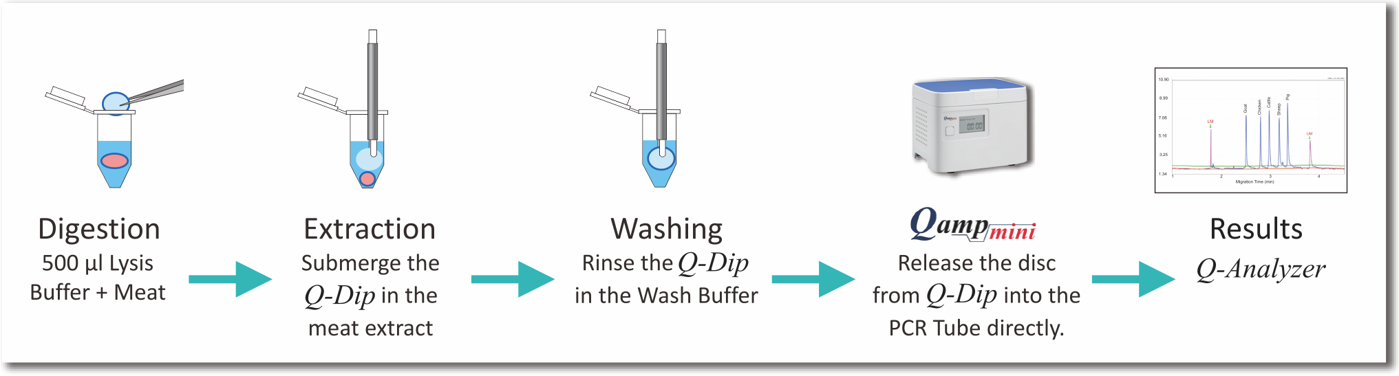 BiOptic "Qexp-FS Meat 5-species kit" utilizes DirectGO PCR reagent with specially designed multiple primer pairs to directly amplify the gene from the sample by multiplex PCR with Qamp mini mini-PCR Thermocycler without gene extraction step. After the species-specific gene has been amplified, the Qsep series automated capillary electrophoresis platforms can rapidly analyze the PCR product and display the result of analysis for defining the source of the meat by Q-Analyzer. The entire process takes only about 60 minutes.