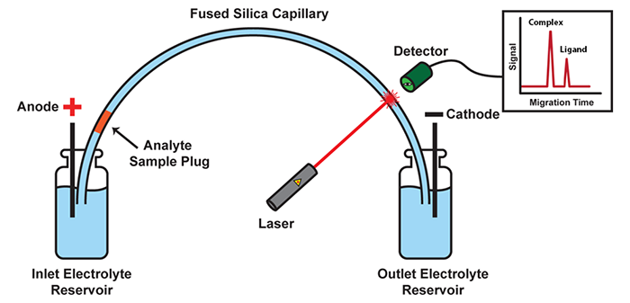 The source vial, destination vial, and capillary are filled with an electrolyte such as an aqueous buffer solution. To introduce the sample, the capillary inlet is placed into a vial containing the sample and then returned to the source vial (sample is introduced into the capillary via capillary action, pressure, or siphoning). The migration of the analytes is then initiated by an electric field that is applied between the source and destination vials and is supplied to the electrodes by the high-voltage power supply.