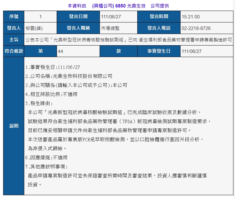 亞洲核酸產業技術服務及儀器開發商光鼎生物科技股份有限公司(簡稱“光鼎生技”,股票代碼:6850)今(27)日公告,自主開發的「光鼎新型冠狀病毒核酸檢驗試劑組」已完成臨床試驗,正式向衛生福利部食品藥物管理署(TFDA)遞件申請專案製造許可。